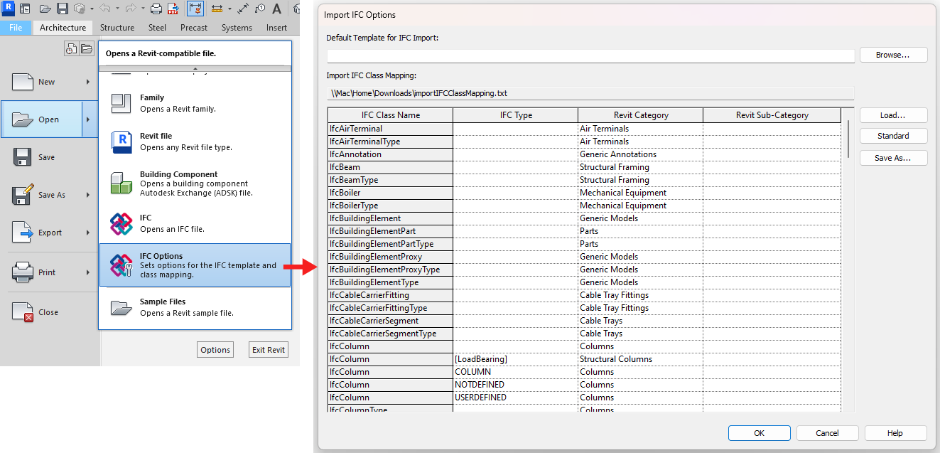 **Import IFC Class Mapping (Import only!):** determines which IFC classes will be assigned to specific Revit categories when an IFC file is opened. By default, these settings should work for most cases, but they can be customized as required. The mapping can be edited directly in the dialog box or by opening and modifying the reference text file.
